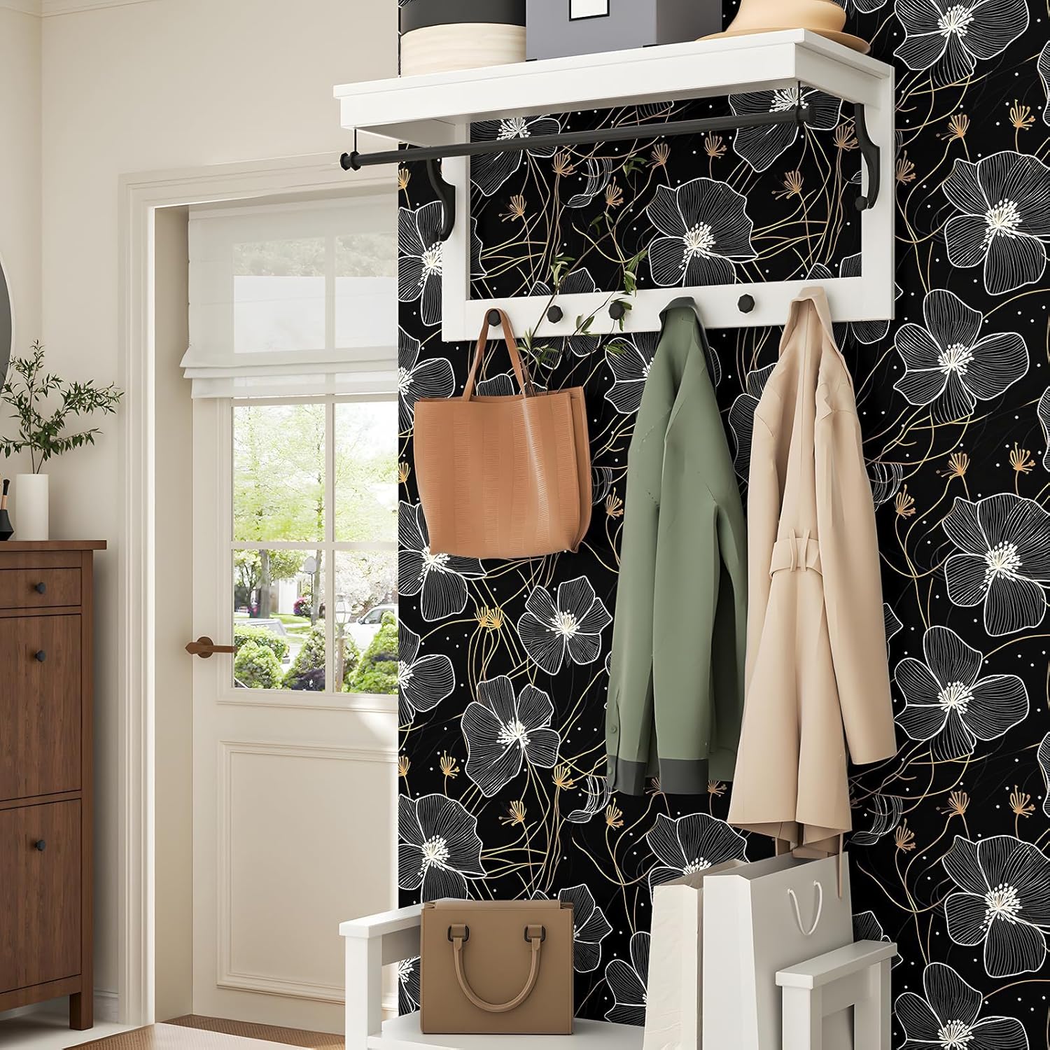 - ✦Features: The dark floral wallpaper has a pattern of white and yellow floral lines and is made of durable vinyl.17.5 inches wide by 118 inches long, covers 14.5 square. This modern wallpaper also waterproof and easy removable.