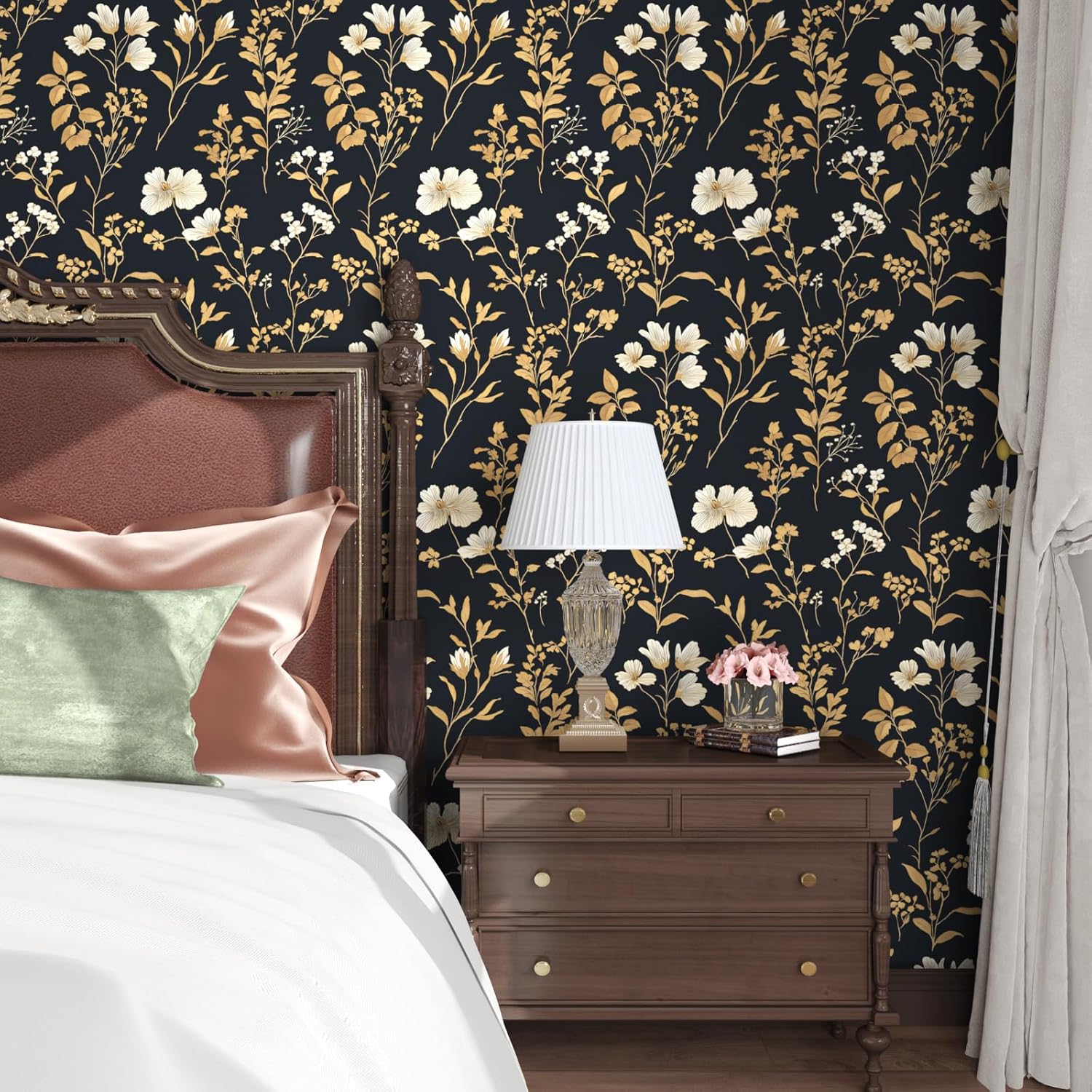 HENNOR - Vintage Black Gold Floral Peel and Stick Boho Wallpaper